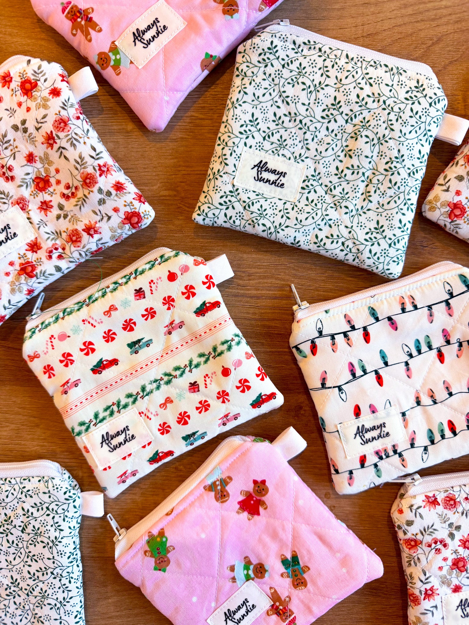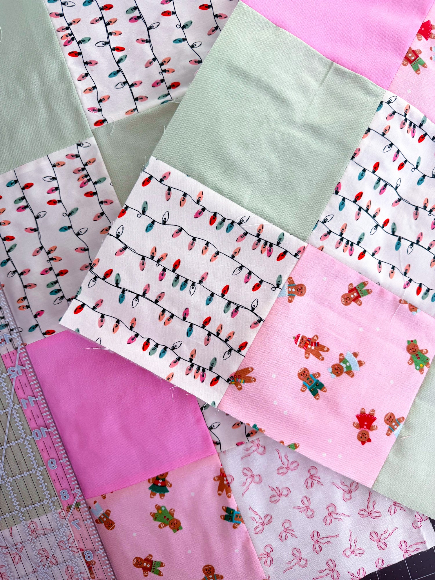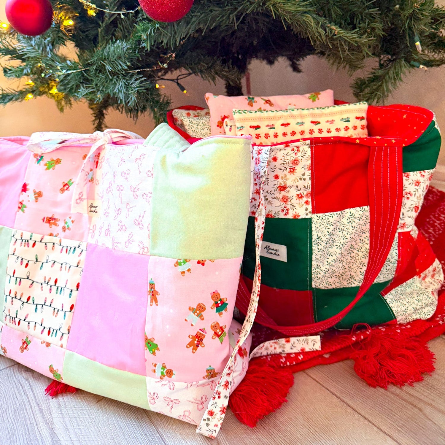 The fabrics were chosen for their classic holiday hues of reds, greens, and lively patterns.