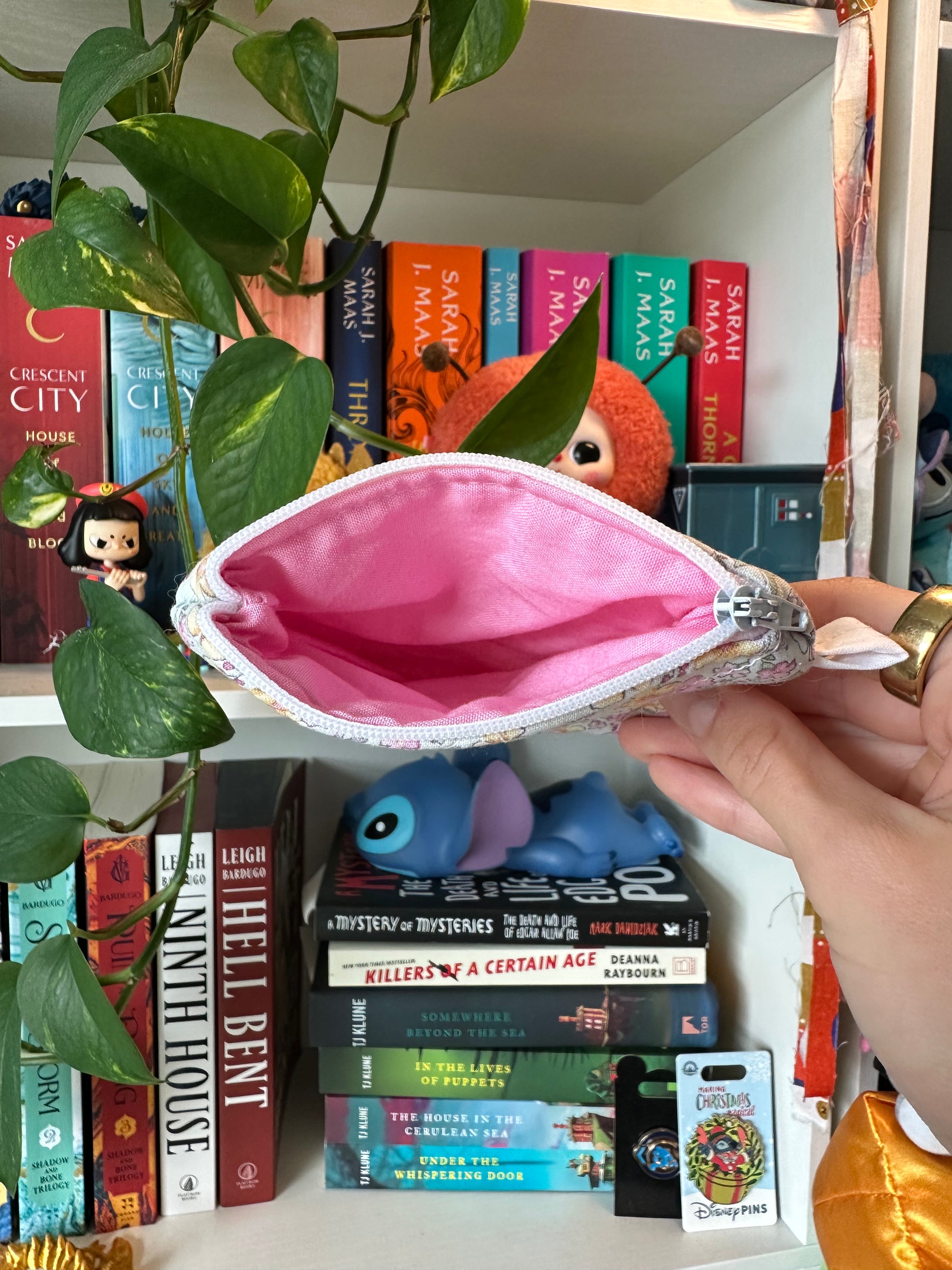 This elegant Daphne wallet is a handmade cozy companion measuring 4" x 4.5". Crafted from 100% cotton inside and out, it’s perfect for stashing cards, cash, lipstick, or any little treasures you want nearby. Featuring a crisp white zipper and a handy side loop, you can clip it to your keys or add a fun keychain to match your style. Keep your essentials cheerful and close with this charming pouch!