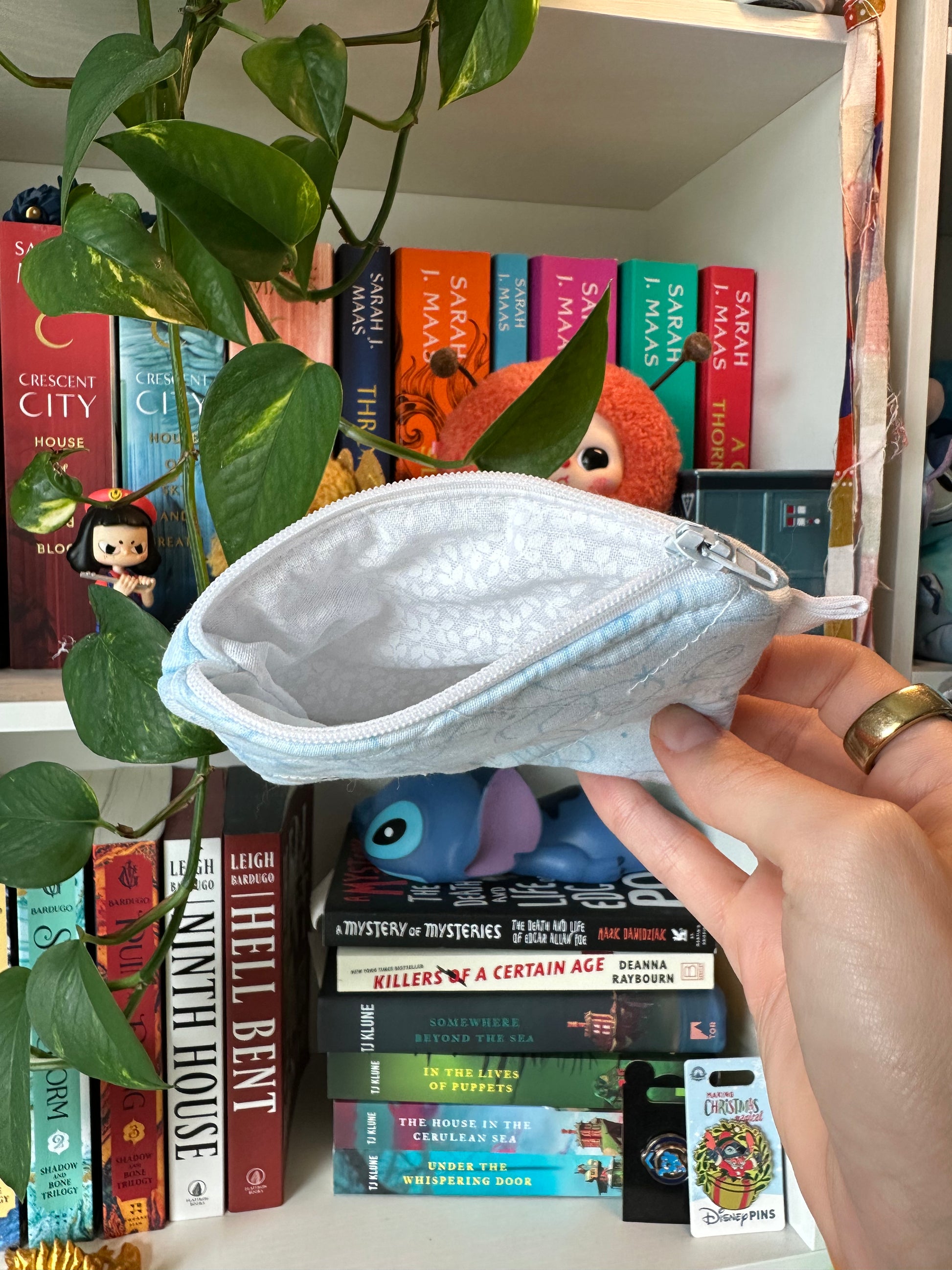 This playful Celeste wallet in blue is a handmade cozy companion measuring 4" x 4.5". Crafted from 100% cotton inside and out, it’s perfect for stashing cards, cash, lipstick, or any little treasures you want nearby. Featuring a crisp white zipper and a handy side loop, you can clip it to your keys or add a fun keychain to match your style. Keep your essentials cheerful and close with this charming pouch!